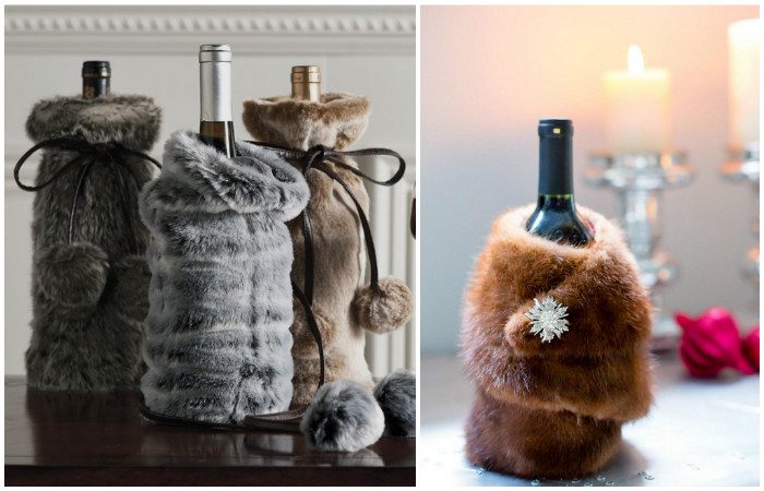 Если натурального меха, в который можно завернуть бутылку, не нашлось, замените его искусственным. Достоинство такого декора заключается еще и в том, что охлажденное шампанское будет медленнее нагреваться.