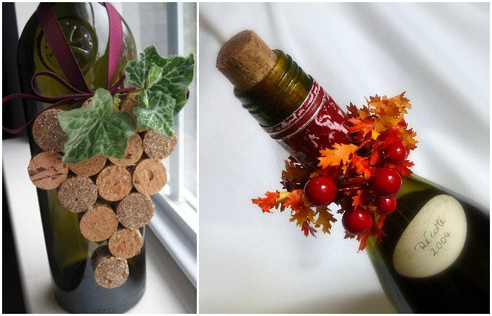 Украшение бутылок при помощи декоративной веревки.Грубая текстура декоративной веревки отлично сочетается с элегантными бантами и блестящими новогодними игрушками. Веревкой можно обмотать бутылку целиком или только ее горлышко.