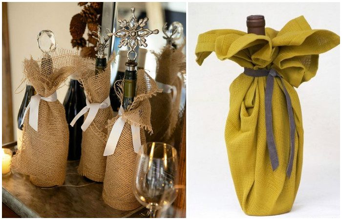 В мешке — не кот, а шампанское.Остатки фетра, вельвета или другого плотного текстиля можно использовать для пошива чехлов для бутылок шампанского. Дополнительно чехлы украшаются аппликациями, пуговицами, бусинами.