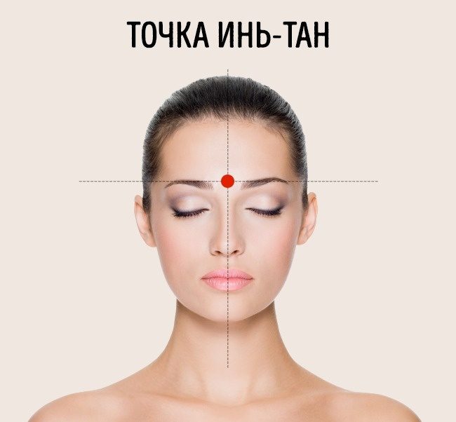 Точка третьего глаза, или инь-тан, находится между бровями, в том месте, где переносица переходит в лоб. Эта точка также отвечает за снятие усталости глаз.
