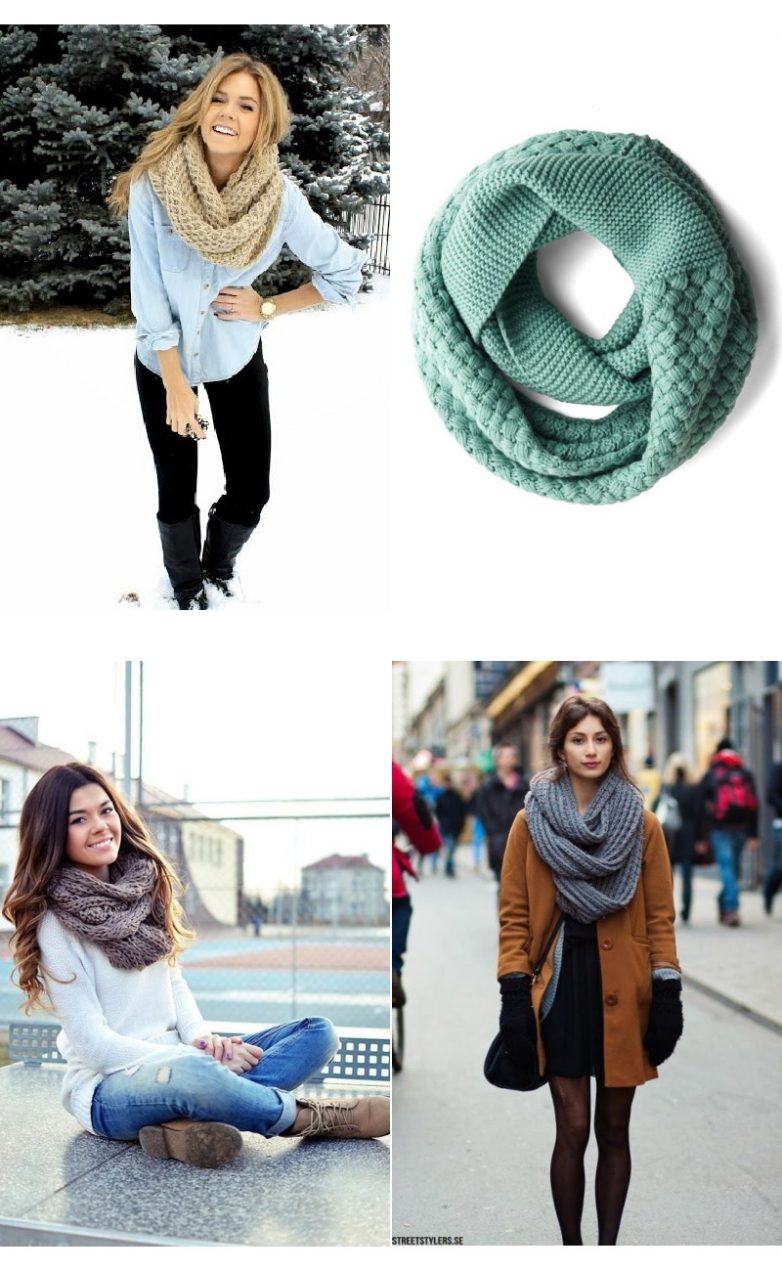 Оригинально и эффектно выглядят аксессуары, имеющие выраженную текстуру или оригинальный орнамент. Они идеально подходят для пальто или куртки, платья или кардигана, блузки или водолазки. Шарф-труба перекручивается в виде восьмерки и одевается на шею. После чего петлям придается форма по вашему усмотрению. Петли можно между собой скрепить брошью, а можно создать интересную драпировку, «играя» с их расположением. Очень эксцентрично и забавно смотрится комбинация разных пар шарфов (по цвету или фактуре).