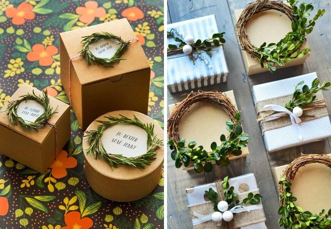 Коробочки с подарками можно украсить тонкими ветвями вечнозеленых растений — например туи, розмарина. Сами коробочки можно легко сделать из картона самостоятельно.
