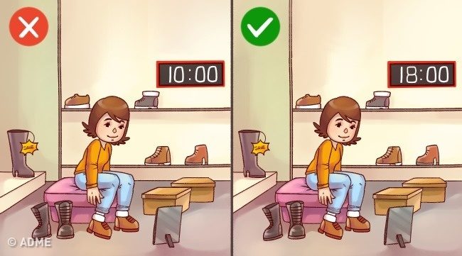 Правильно покупать обувь именно по вечерам. Потому что к концу дня ноги немного отекают и, следовательно, увеличиваются в размерах, а это значит, что та пара обуви, которая подошла вам утром, вечером будет слишком узкой и натрет ногу.
