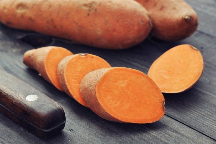 Оказывается, именно сладкий картофель батат, а вовсе не огурец – самая полезная «пища» для кожи вокруг глаз. Батат обладает противовоспалительными свойствами и отлично снимает отёчность. Тонкий ломтик, 10 минут – и мешков, как не бывало. Жаль, в наших широтах – продукт весьма экзотический.