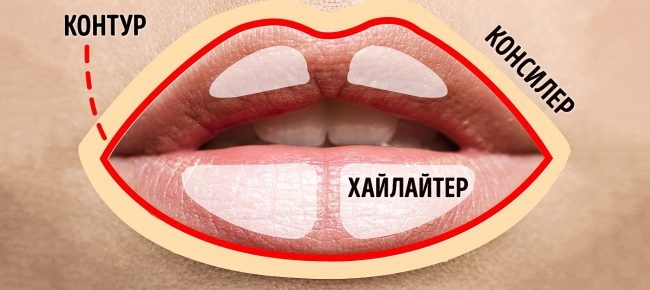 Нанесите контур карандашом по кругу и на средину губ, затем накрасьте помадой. После этого нанесите консилер вокруг губ и хайлайтер, как показано на фото, чтобы создать эффект пухлых губ.