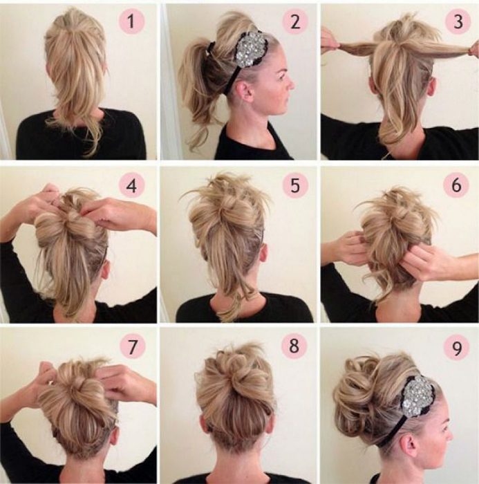 Обычный высокий пучок можно превратить в элегантную вечернюю прическу, украсив его декоративной резинкой-ободком.