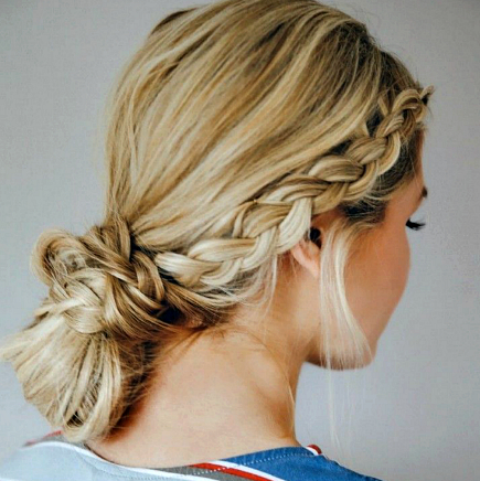 Романтичная и стильная прическа, которая представляет собой низкий пучок, сформированный из трех кос. В зависимости от ситуации и назначения прически, подобный пучок можно сделать гладким или небрежным, с челкой или без, украшенный цветами, лентами или обычной резинкой.