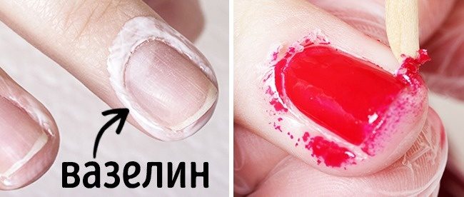 Вы сможете легко очистить измазавшийся палец от лака, если нанесете вазелин на кутикулу и кожу вокруг ногтя, как показано на фото, а потом уберете излишки лака деревянной палочкой. Кстати, вместо вазелина подойдет и жирный крем.Как «вылечить» надломленный ноготь