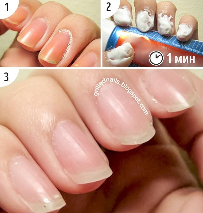 Замечали, наверное, что от темных лаков на ногтях остаются пятна? Неэстетично и некрасиво. Но выход есть! Нанесите отбеливающую зубную пасту на ногти, слегка потрите щеткой — и через 1 минуту ногти снова прекрасны.