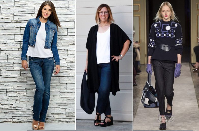 Какая же современная активная женщина обойдется без них? Выбирайте качественные джинсы. Тогда они будут поддерживать ягодицы, уменьшать их и визуально удлинять ноги. В 40 лет самое время забыть о вышивках и стразах на джинсах. Важно правильно подобрать фасон под конкретную фигуру. Тогда они будут смотреться гармонично. Цвет предпочтительно синий или черный. Джинсы остаются прекрасной повседневной одеждой для путешествий, прогулок, пикников. Чего не скажешь о деловых встречах. Несмотря на классику фасона, не стоит одеваться так на работу. Джинсы остаются одеждой для отдыха.
