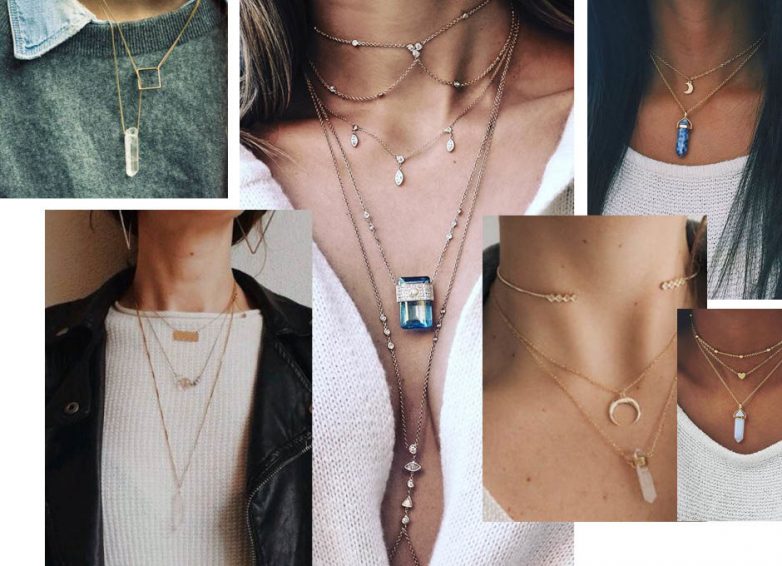 Тонкие цепочки с кристаллами или миниатюрными кулонами смотрятся особенно нежно и женственно на фоне объемного трикотажа. Носите два тонких чокера одновременно или сочетайте один с длинной цепочкой. Не имеет значения, выберете ли вы свитер с круглым вырезом или V-образным, все комбинации украшений будут уместны.