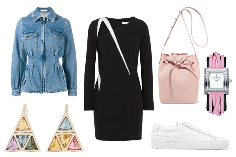 Деловое платье в романтичное? Легко! Достаточно надеть пастельные аксессуары: часы на нежном кожаном ремешке и небольшие серьги, похожие на леденцы, кроссовки и джинсовый жакет свободного кроя. И воздушный весенний образ на основе «серьезного» платья готов