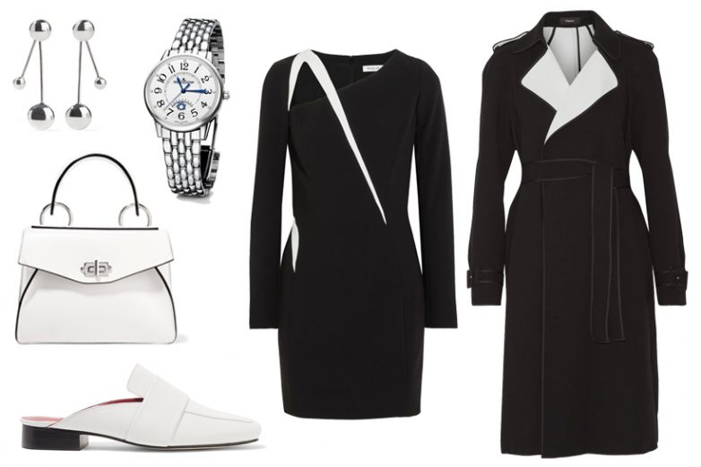 Черно-белая гамма и металлические аксессуары придадут комплекту строгости. Ничего лишнего: комплект, практически стерильно минималистичный, пригодится для деловой встречи по серьезным вопросам.
