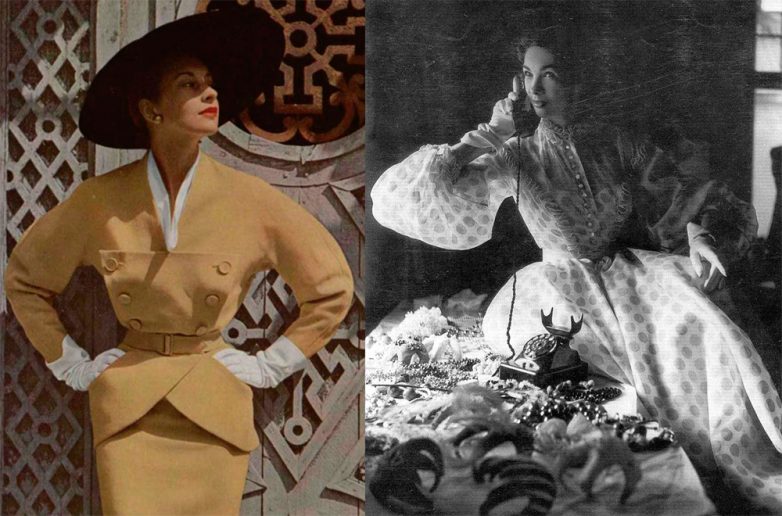 1951 год – чуть облегающие и чуть свободные с жакетом, в котором прилегающий лиф и летящая спинка.1957 год – прямые и свободные платья-мешки, которые перешагнули десятилетие 50-х и отправились в 60-е.