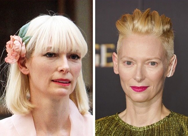 Прическа Тильды меняется в зависимости от экранного амплуа, но по возможности она всегда возвращается к короткой стрижке. Короткие волосы еще больше подчеркивают скрытую сексуальность актрисы и ее аристократическое шотландское происхождение.