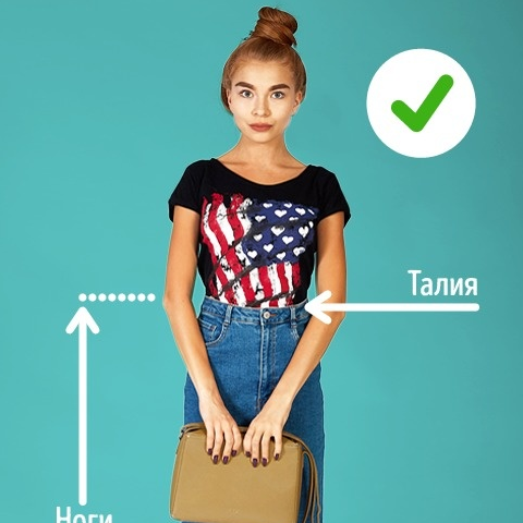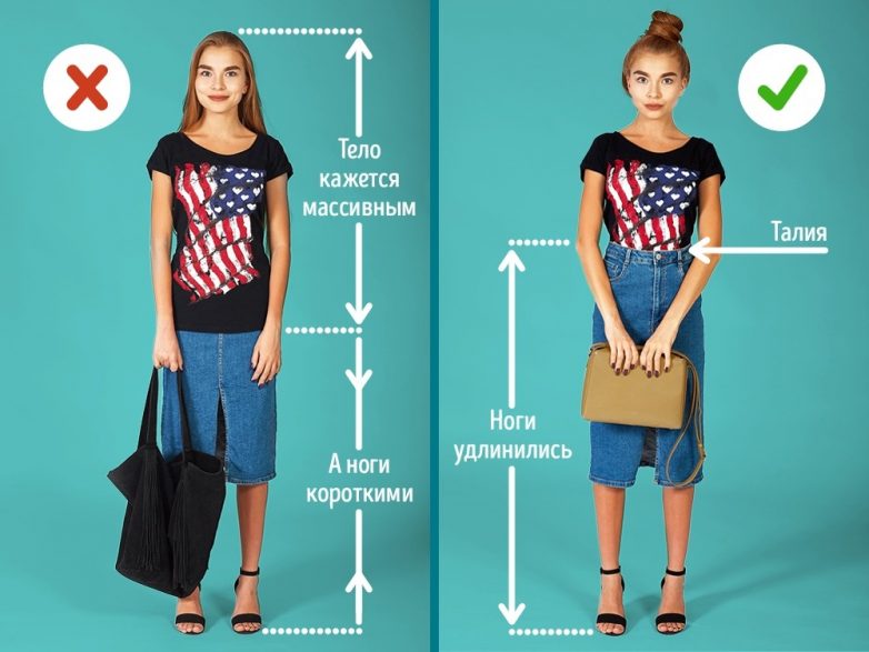 Чтобы выглядеть отлично, важно не забывать о пропорциях фигуры, которые можно задать с помощью одежды. Выпущенный наружу топ «разрежет» фигуру пополам, сделает туловище более массивным и длинным, а ноги — укоротит. Топ лучше заправить в юбку — так мы акцентируем талию, удлиним ноги и в целом сделаем фигуру более хрупкой и стройной. Еще вариант — укороченный топ с юбкой.