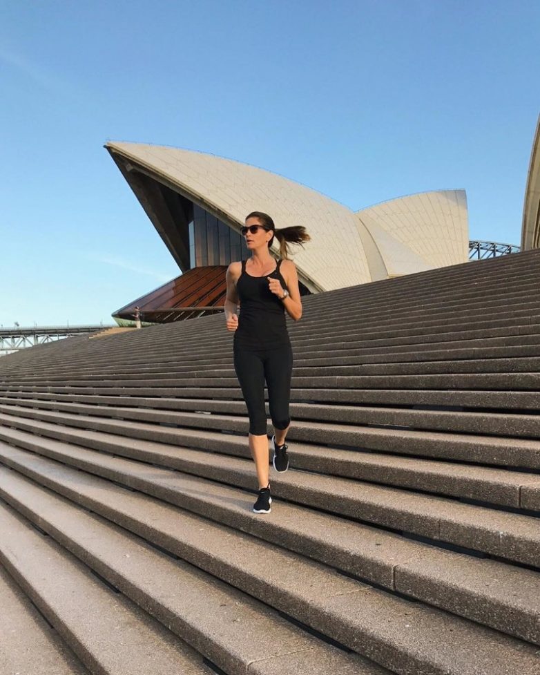 Ее тренировка включает работу с весами и много старых добрых выпадов и приседаний. Чтобы поддерживать высокий пульс, она бегает вверх-вниз по лестнице интервалами и завершает тренировку упражнениями на пресс на коврике.