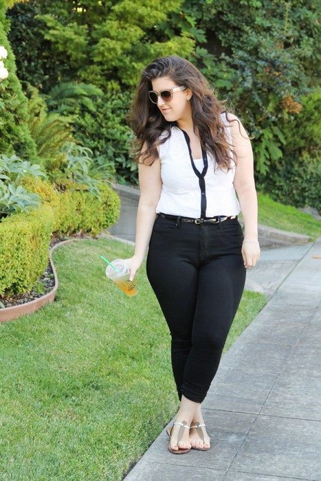 Многим девушкам этот совет может показаться парадоксальным, но стилисты рекомендуют леди с формами не бояться узких джинсов. Главное правило: они должны быть достаточно плотными и с высокой посадкой. Тем самым достигается лёгкий эффект утяжки и при этом баланс с внушающим уважение бюстом. И, да, отдать предпочтение советуют тёмным оттенкам денима, а вот от светло-голубых и белых джинсов лучше отказаться.