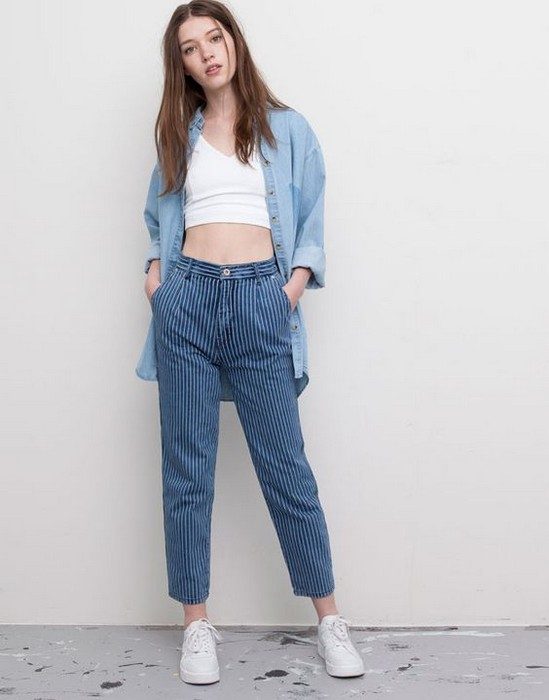 Если вы обладаете пропорциональными грудью и бёдрами – смело подчёркивайте талию. Этим вы сделаете фигуру еще более сбалансированной. А помогут в этом джинсы с актуально завышенной линией талии. При том ширина самих штанин может быть практически любой. Но стилисты рекомендуют воздержаться от комбинезонов и слишком широких брюк по типу палаццо: они привлекут внимание к бёдрам, а вот осиную талию, увы, «съедят» без остатка.