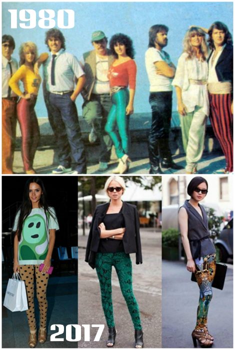 Яркие обтягивающие лосины стали настоящим символом молодежной культуры 80-х. Как известно, мода циклична и броские леггинсы кислотных оттенков, с замысловатыми узорами и металлическим блеском снова в тренде. Носить такие брюки можно с короткими юбками, платьями, шортами, туниками, майками и свитерами оверсайз.