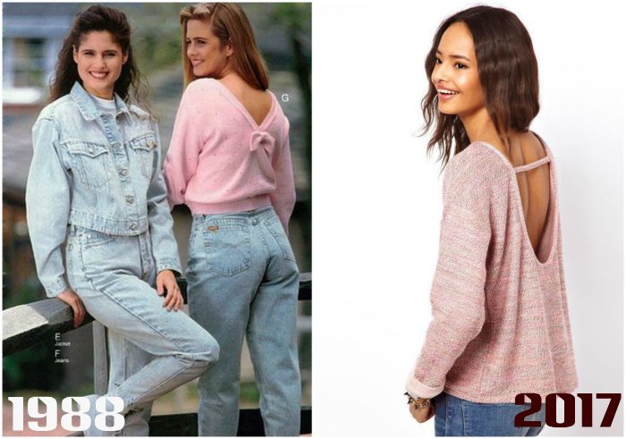 Как и в конце 80-х в моде вязаные и трикотажные свитера с открытой спиной. Конечно, с тех пор разрезы стали больше и соблазнительные, но и в гардеробе мамы может найтись стоящая вещь, которую можно смело использовать сегодня.