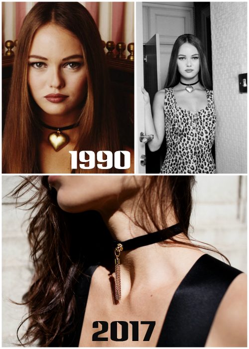 Чокер — короткое шейное украшение, которые носили женщины самых разных эпох, но именно в 90-х годах он перестал быть просто украшением и стал настоящим трендом. В 2017-м слово чокер приобрело новое звучание, но его внешний вид особо не изменился. Как и в 1990-м, в моде украшения из проволоки, лент или кожи, дополненные пластиковыми бусинами, драгоценными камнями, шипами и стеклярусом.