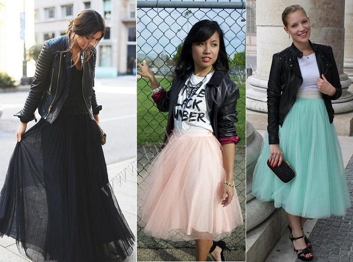 Байкерская куртка отлично сочетается с юбкой-пачкой