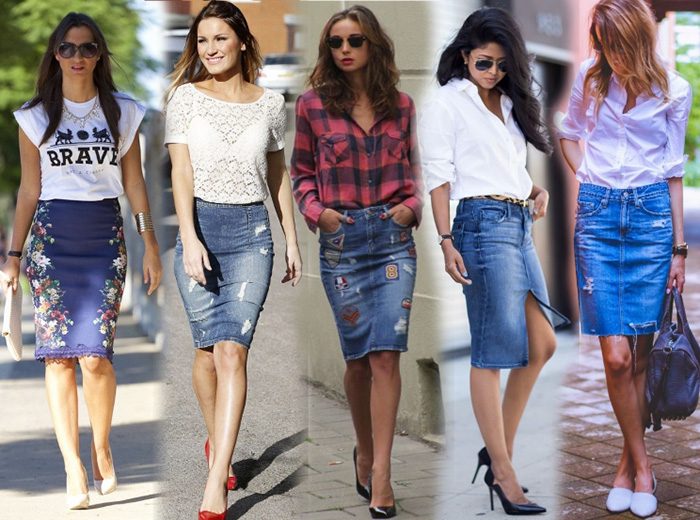 Джинсовая юбка-карандаш – находка для любой девушки. Она, наверняка, придется по душе любительницам офисного стиля. К тому же, такая вещь очень проста в комплектации. Выбирайте классические рубашки самых разнообразных цветов. Кстати, деним тоже подойдет! Элегантные белые блузы, топы, футболки, разноцветные майки – все отлично сочетается! Что касается обуви, то здесь тоже полная свобода в выборе: туфли-лодочки для офиса, босоножки с устойчивым каблуком для городских прогулок и кеды – для образа в стиле кэжуал.