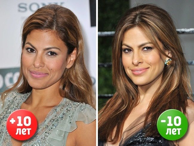Прибавляет возраст: Ненакрашенные ресницы, даже при полном макияже.Делает моложе: Воспользуйтесь щипцами для завивки ресниц и тушью для создания объема. Широко распахнутые глаза способны «стереть» десять лет с вашего лица.