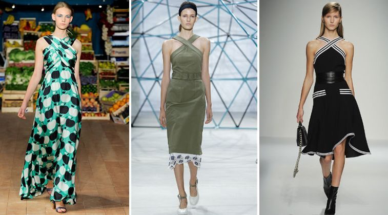 Такой вырез представляет собой скрещивание двух элементов сарафана, которые соединяются между собой на шее. Спина и плечи остаются обнаженными. Сарафаны с такой горловиной могут быть как пляжные, так и вечерние. Подойдут для женщин среднего роста с типом фигуры «песочные часы». Обладательницам покатых и массивных плеч лучше отказаться от такой модели.