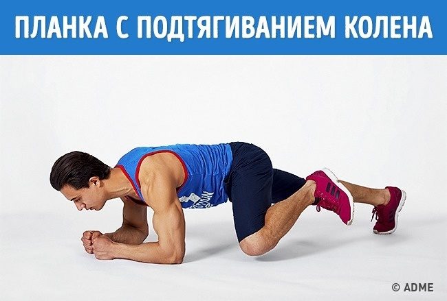 Исходное положение — планка с опорой на локти. Подтяните левое колено к левому локтю. Вернитесь в исходное положение. Затем выполните с другой ноги. Повторите 12 раз.