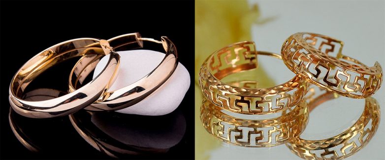 Если говорить о материалах, серьги могут быть и серебряные, и золотые, и просто из различных сплавов, а также из пластика и дерева. Диаметр кольца – от малого, до великого.Кольца могут быть гладкими или с узорами, с алмазной гранью или эмалью, инкрустированные бриллиантами или другими драгоценными камнями. Современные ювелиры украшают серьги различными дополнительными элементами, например, бабочками или жемчужными подвесками, бриллиантовым паве или скрепленными в одном месте несколькими кольцами разного диаметра. Серьги выполняют, сочетая различные цветовые оттенки золота: желтое, белое, красное.