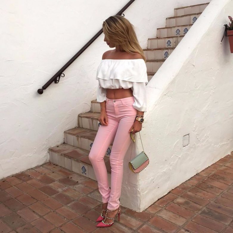 Образ в стиле total white не уходит из моды. Лаконичная белая футболка с джинсами будут смотреться стильно, но слишком скучно, поэтому без аксессуара не обойтись. Кэжуал-образ тоже можно сделать женственным без потери практичности. Пестрая кофта с оборками и босоножки с ремешками послужат отличной “приправой“ к однотонным белым джинсам. Еще одним важным моментом в создании идеального образа является игра с пропорциями. Джинсы-скинни лучше всего будут смотреться с объемным верхом. В данном случае со свитером.