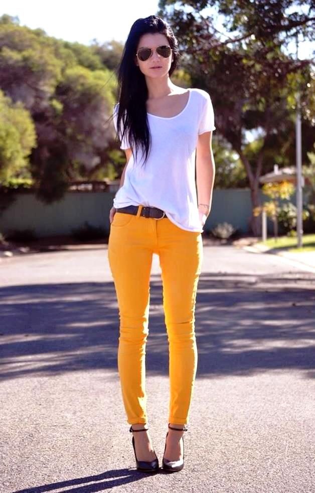 Помимо белого, любой из цветов радуги, воплощенный в твоих джинсах, будет крайне моден на сегодняшний день, будь то фиолетовые, красные, желтые, зеленые или оранжевые джинсы. Однако супермодными считаются все оттенки красного — от бледного розового до насыщенного алого.