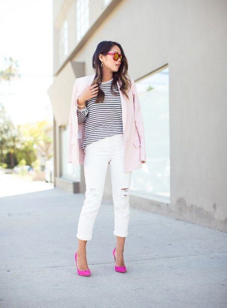Весна и лето – лучшее время для светлых брюк. Белые джинсы с прорезями на коленях в паре с классической тельняшкой и курткой из денима – то, что нужно для прохладных весенних вечеров. жинсовую рубашку всегда сложно “подружить“ с другими вещами из денима, но белые джинсы вне конкуренции. Добавим немного женственности. Укороченные белые джинсы + блузка с принтом + каблук = идеальный ансамбль для свидания.