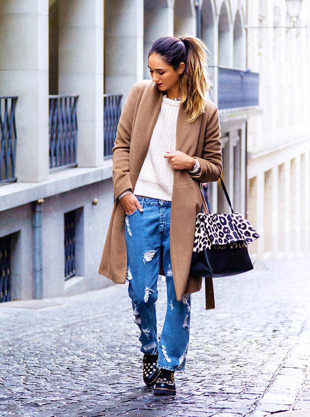 Привыкла к деловому стилю? Тогда этот образ для тебя. Но вместо строгого пиджака – удлиненный блейзер, вместо блузки – футболка, вместо классических брюк – белые джинсы с потертостями и прорезями. Многослойность – тот тренд, который не скоро канет в лету. Джинсы, свитер, пальто – это всего лишь одна из самых простых вариаций.