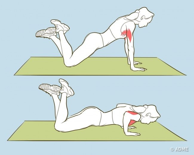 Поставьте руки на скамье на ширину плеч. Ноги выпрямите. Напрягите пресс. Опустите корпус, согнув локти. Старайтесь держать тело ровно. Вернитесь в исходное положение. Если упражнение делать сложно, согните колени. Когда опускаетесь — выдох, а когда поднимаетесь — вдох.