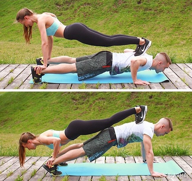 Что тренируется: Большие грудные мышцы, трицепс, плечи и пресс.Как выполнять: Парень принимает упор лежа на полу, девушка принимает его на спине парня — ее руки упираются в голени партера, а ноги находятся на его плечах. Парень отжимается, удерживая девушку на спине, а когда он возвращается в исходное положение, то отжимание совершает девушка.
