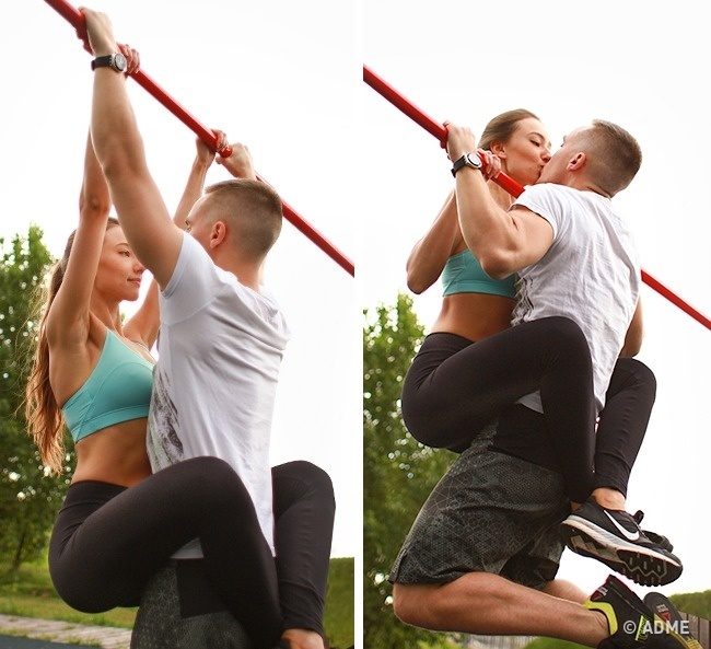 Как выполнять: Парень и девушка берутся за перекладину, девушка обхватывает парня ногами, выполняя роль утяжелителя. Партнеры начинают одновременно подтягиваться. Приятный бонус — поцелуй после каждого повтора.