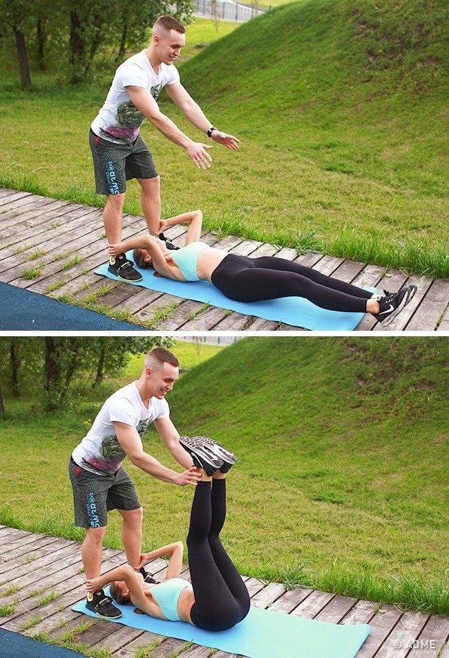 Что тренируется: Нижняя часть мышц брюшного пресса.Как выполнять: Парень стоит, девушка ложится на пол, берется руками за щиколотки партнера и начинает поднимать ноги под углом 90°. Парень при этом вытягивает руки и отталкивает ноги девушки, возвращая их в исходную позицию, затем партнеры меняются местами.