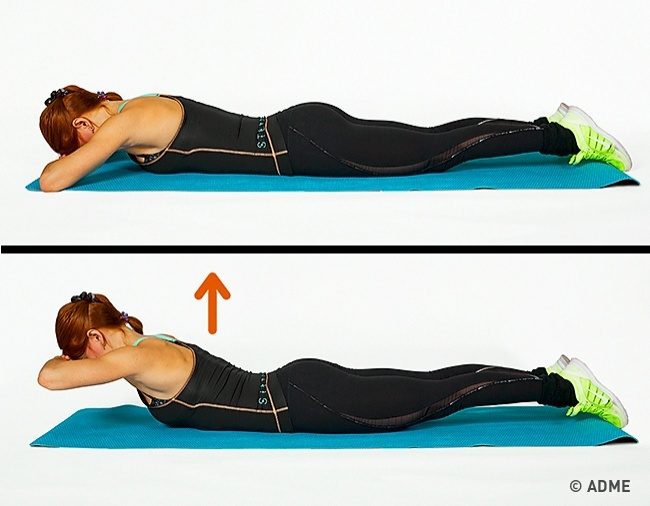 Как делать: Лягте на пол лицом вниз, согнув руки в локтях и положив их под голову. Максимально поднимите верхнюю часть тела. Задержитесь на секунду в таком положении и медленно опускайтесь обратно.