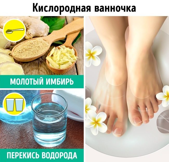 Разведите в ванночке с горячей водой 1 ст. л. молотого имбиря и 2 стакана перекиси водорода. Дайте настояться в течение 30 минут. Подержите ноги в растворе 25 минут.