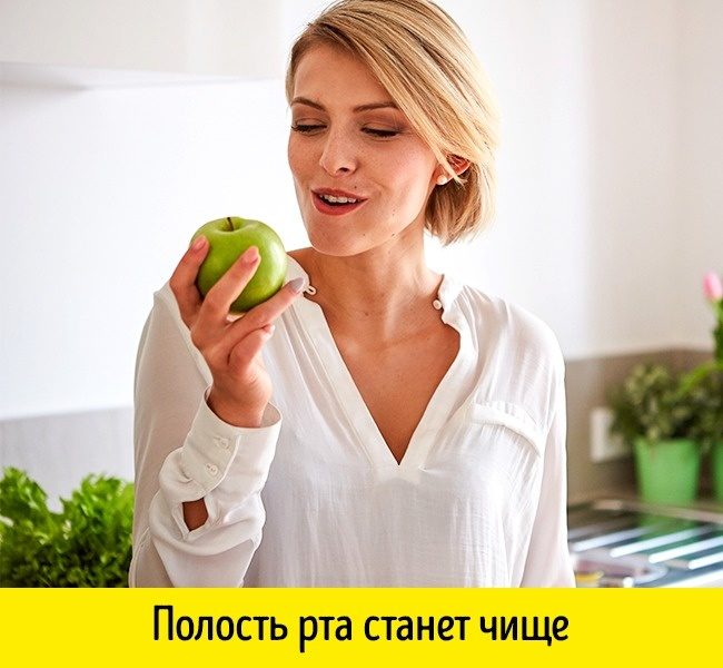 Чистить зубы желательно каждый раз после приема пищи, но, конечно, делать это получается не всегда. Есть очень простое и вкусное решение. После еды съедайте яблоко. Так вы очистите полость рта от остатков пищи, улучшите кровообращение в деснах и нормализуете кислотность во рту. Полюбите свежие овощи и фрукты, и вам никогда не придется мучиться с пародонтозом.