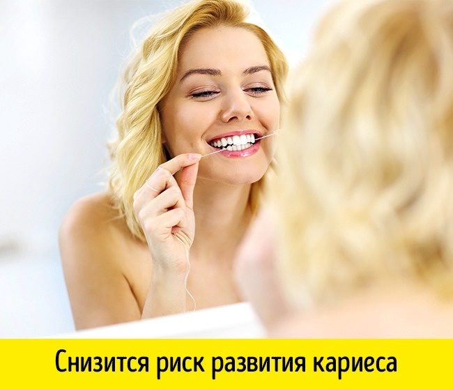 Вредные перекусы — это враг здорового образа жизни. Казалось бы, ничего сложного в том, чтобы не есть вредные батончики и печенье, нет, но статистика говорит об обратном. Чтобы снизить соблазн перекусывать вредной едой между основными приемами пищи, носите с собой несколько здоровых снеков. Вашей полезной закуской могут стать фрукты, зерновые хлебцы, йогурты. Привычка перекусывать снеками, состоящими не из быстрых углеводов, уже через месяц ощутимо скажется на вашем весе.4. Пользуйтесь зубной нитью