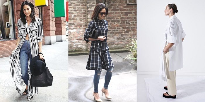 Платье-рубашка + брюки или джинсы-скинни – самый простой вариант подобного сочетания, который отлично подойдет для начала модного эксперимента. В таком простом комплекте сложно чувствовать себя нелепо. Свободный крой рубашки и брюки-дудочки создадут прекрасный модный ансамбль, который сможет вынести любая женщина. Такой наряд универсальный: он отлично подойдет как для работы, так и для прогулок по городу.
