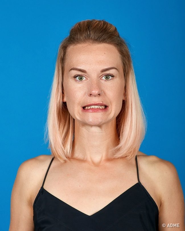 Сомкните губы и сожмите верхнюю и нижнюю губу между зубами. Из этой позиции максимально приподнимите уголки губ.