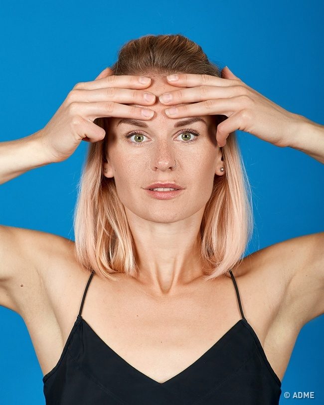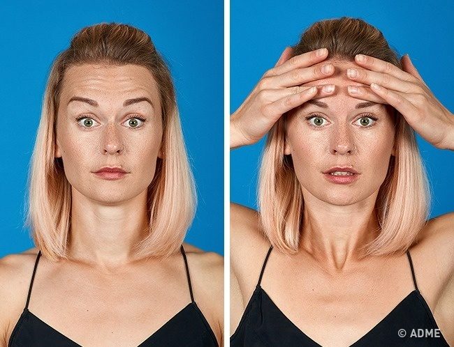 Важно: в этом движении руки должны «победить». Не давайте бровям подниматься! Иначе эффект от упражнения будет прямо противоположным. Напрягите мышцы, считая до 6, затем расслабьте их. Повторите упражнение от 5 до 20 раз.