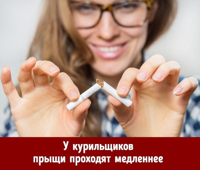 Курение ухудшает регенерацию кожи, прыщи заживают медленнее.