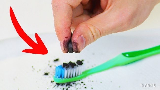 Отбеливание активированным углем — один из самых простых и дешевых способов. Достаточно размельчить одну таблетку, обмакнуть смоченную в воде зубную щетку в порошок и как обычно почистить зубы.