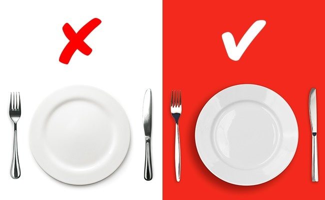 Используйте контрастные цвета посуды и скатерти. В данном случае сработает иллюзия Дельбёфа. Обычная тарелка с нормальной порцией будет выглядеть крупной. Вам будет казаться, что вы едите больше, хотя порции останутся обычными. В результате вы почувствуете сытость раньше, а калорий поступит столько же или даже меньше.